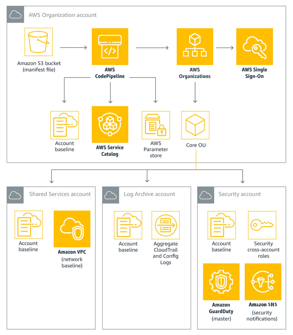 AWS Landing Zone triển khai AWS Account Vending Machine (AVM) để cung cấp và tự động tạo lập các tài khoản mới. Giải pháp này bao gồm 4 tài khoản và các sản phẩm add-on sử dụng AWS Service Catalog được thiếp lập cùng nhau.