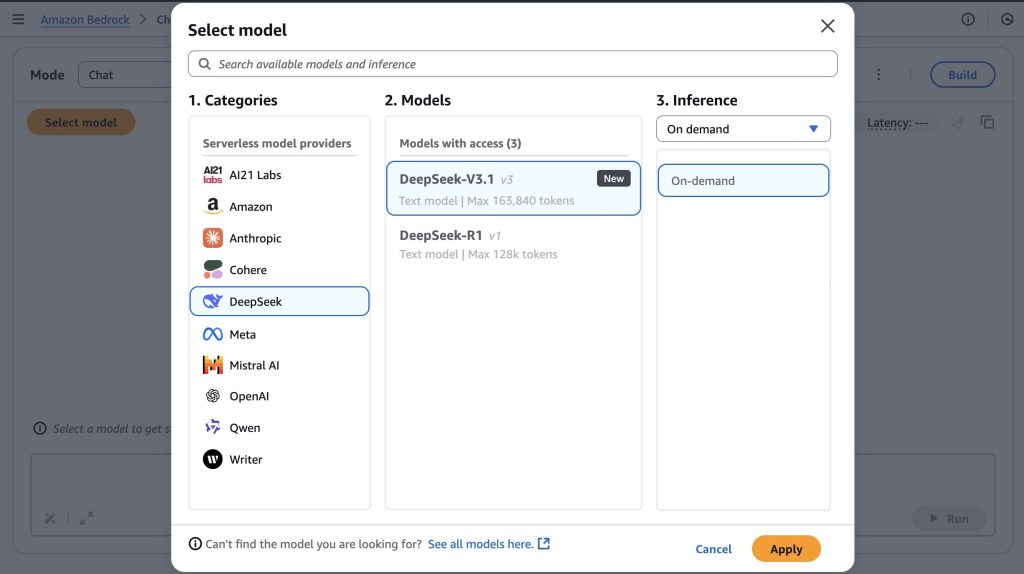 Bắt đầu từ ngày 18/9, DeepSeek-V3.1 đã có mặt dưới dạng mô hình nền tảng (foundation model) được quản lý hoàn toàn trong Amazon Bedrock. DeepSeek-V3.1 là một mô hình AI lai (hybrid open weight), có khả năng kết hợp chế độ “tư duy” chain-of-thought reasoning để phân tích chi tiết từng bước và chế độ “không tư duy” non-thinking mode để đưa ra câu câu trả lời nhanh hơn.